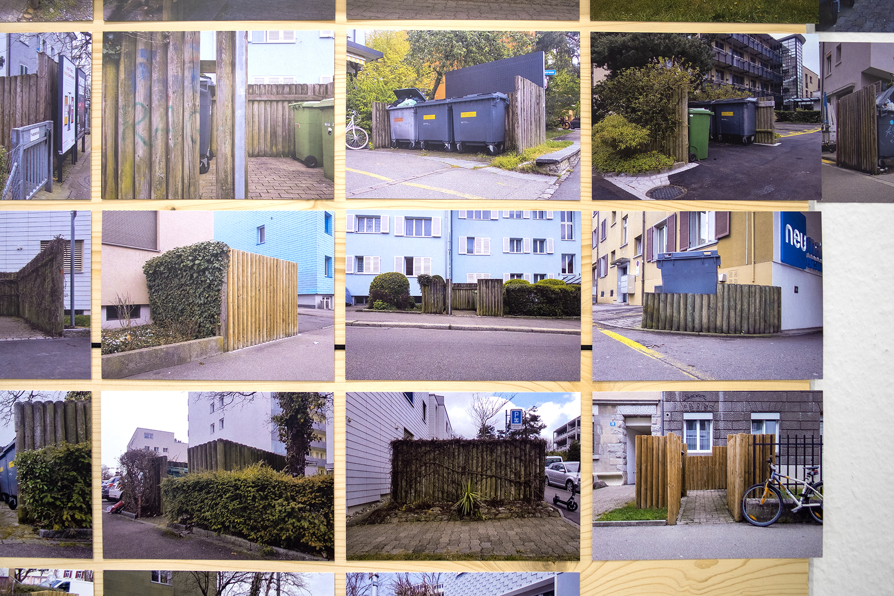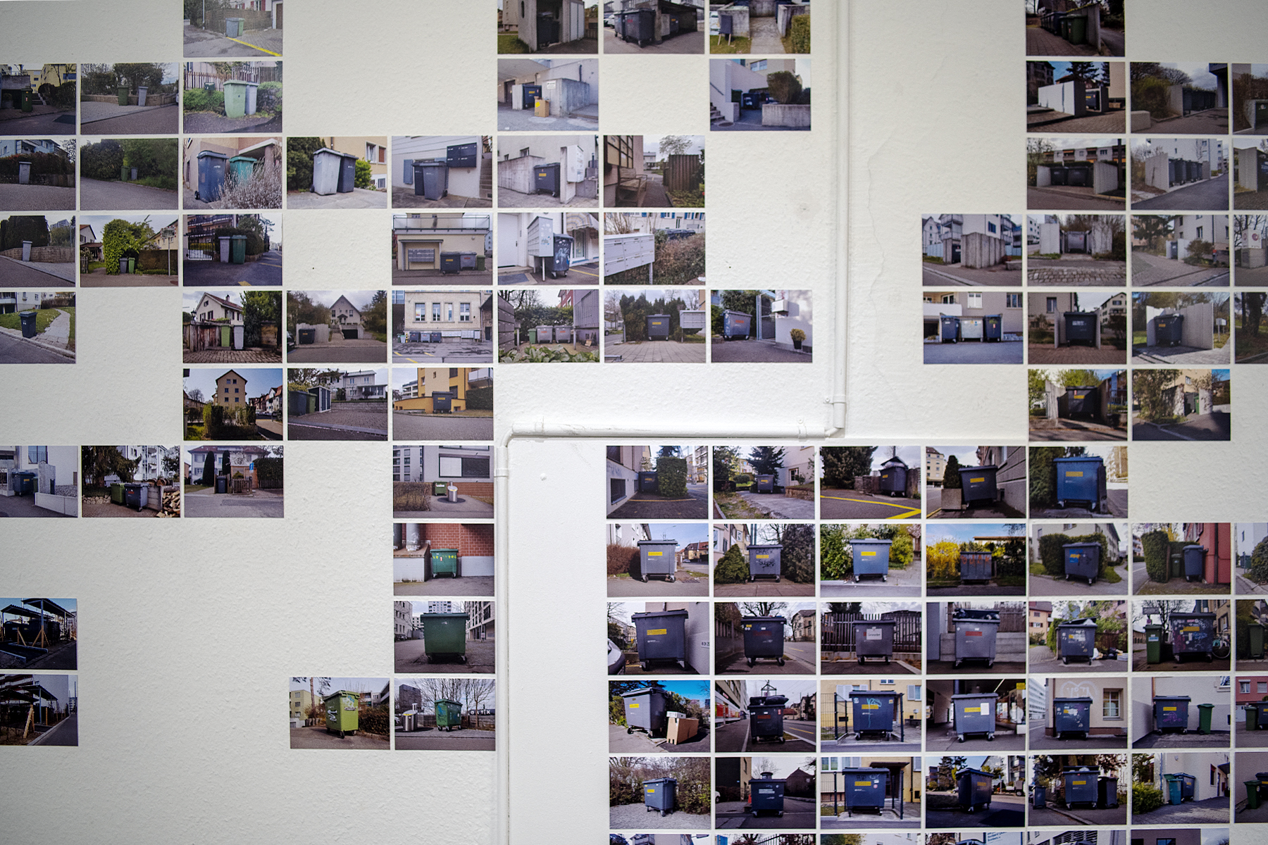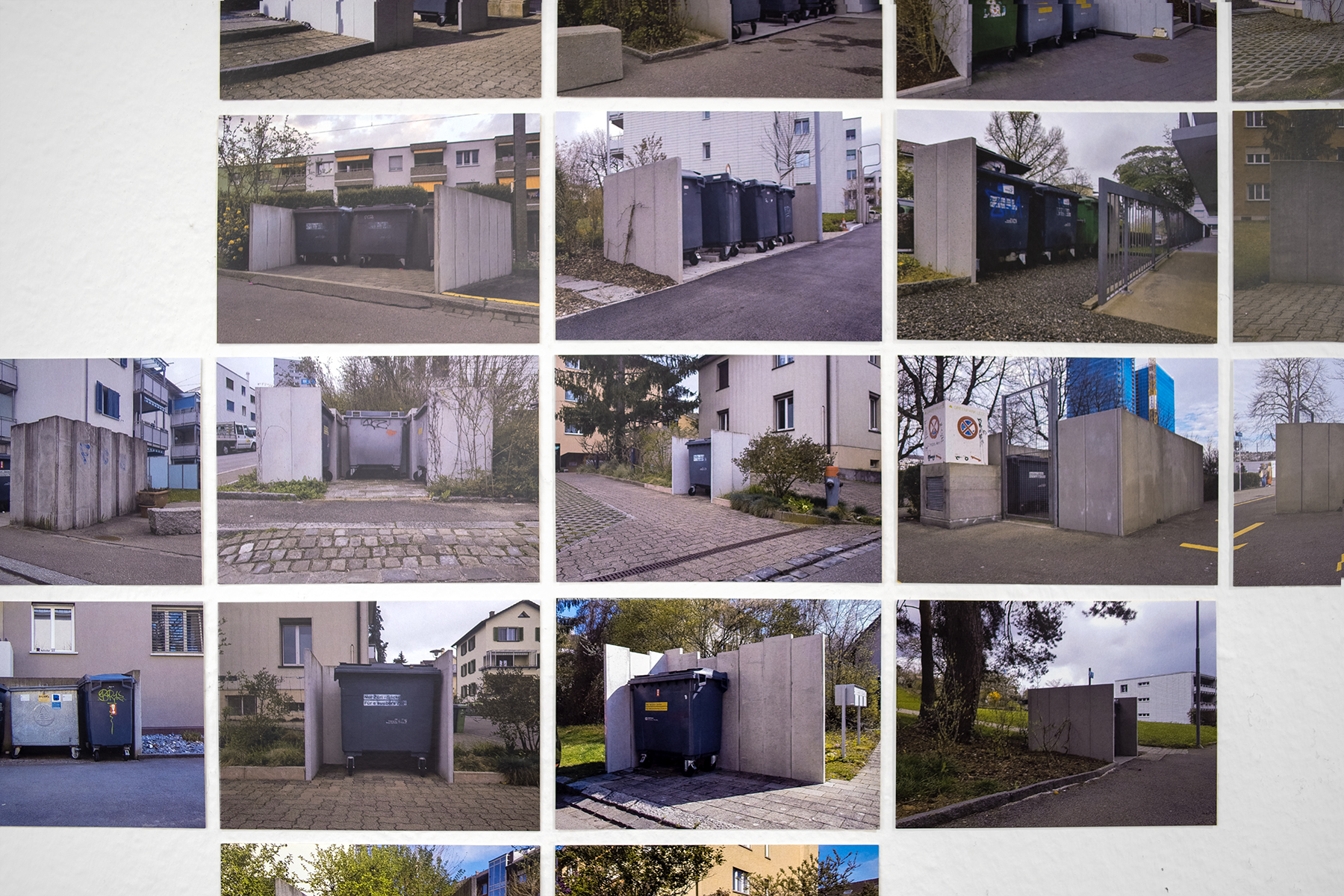 Das Ausmass der Fülle an Züri-Sack-Container in Zürich fällt erst auf, wenn mensch nach ihnen Ausschau hält – ein Beispiel des selektiven Blicks im Alltag. Mit den Containern geht eine architektonische oder räumliche Rahmung einher: die Einhausung. Bei den Einhausungen und den Standorten der Container treffen zwei Sets von Normierungen aufeinander: einerseits der Container und seine Handhabung, andererseits die sonstige gebaute Umwelt. Die Form von Postkarten thematisiert die (nicht-) Vermarktung von urbanen Qualitäten.